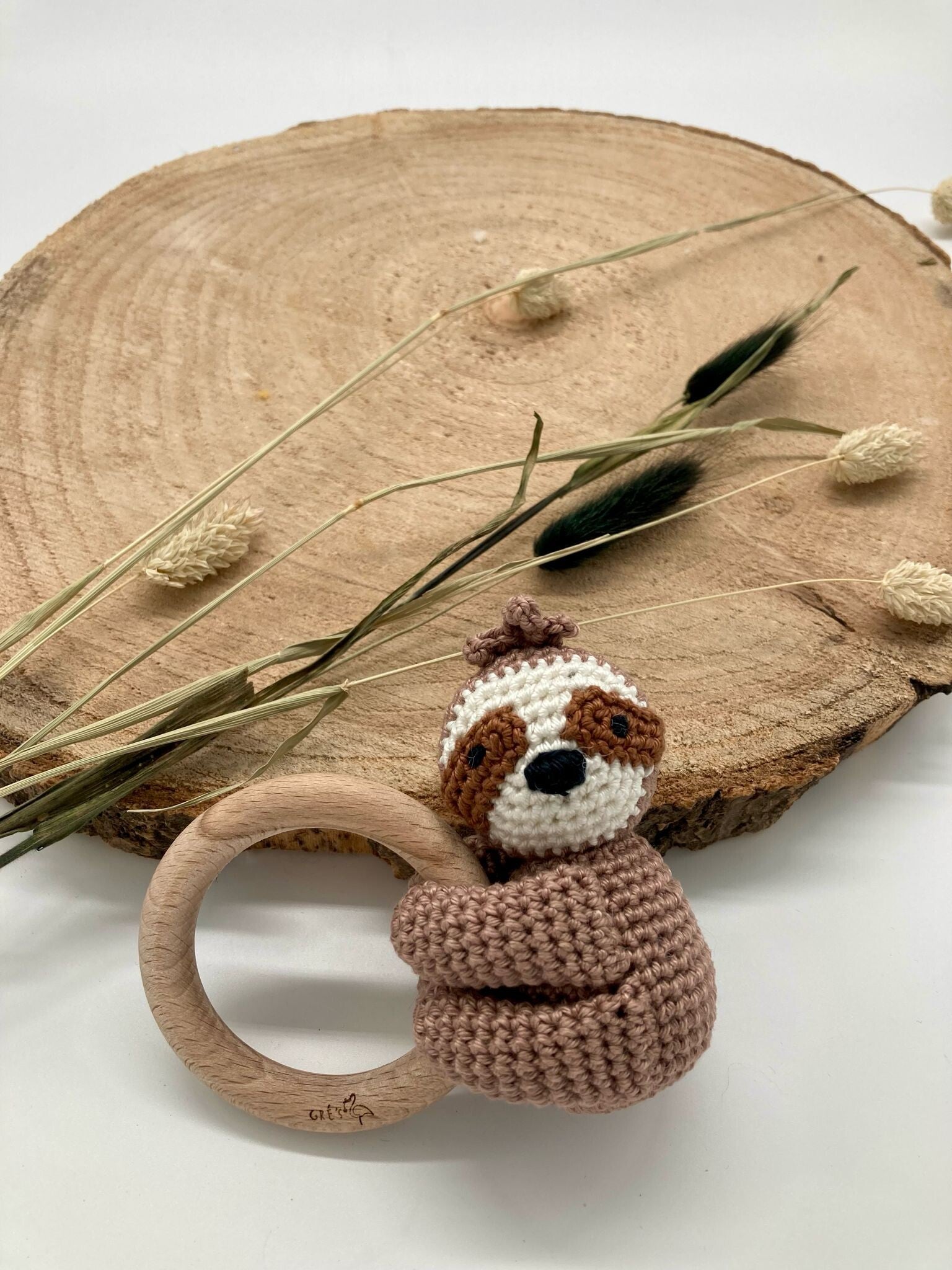 Alle rammelaars zijn gemaakt met een beukenhouten ring en gehaakt met 100% katoengaren. In de rammelaar zit een rammelkraal verwerkt.